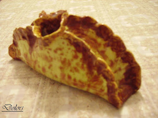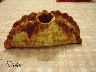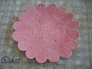 Este plato está hecho con arcilla blanca. El dibujo lo hice marcando con un rodillo una blonda de pastelería, posteriormente pintado, barnizado y cocido.