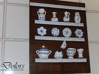 La madera viene sin color y lleva unas tiras semejando estanterias y dos un poquito más anchas con sus tiradores que parecen dos cajones. Yo le di ese color para que pareciera antiguo y adorné las tiras de estantería con puntilla para darle el aspecto de una alacena. Después pegué y ese es el resultado.