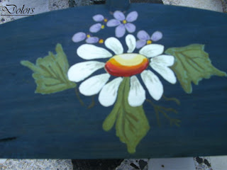 La base una vez bien lijada se pinta con azul diluido en agua. Una vez seco se calca el dibujo que se desee, se pinta todo el en blanco y después se le dan los colores que lleve el dibujo. En mi caso como son flores así ha quedado.